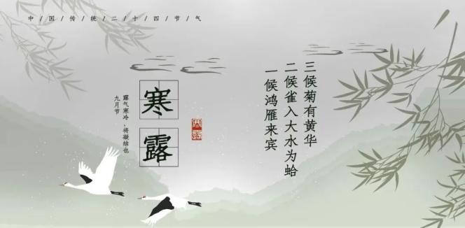 鸿雁来宾:自白露开始,就有鸿雁陆续南迁,到寒露时,最后一批鸿雁会排成一字或人字形的队列大举南迁。古人称后至者为 “宾”,所以有了 “鸿雁来宾” 的说法。