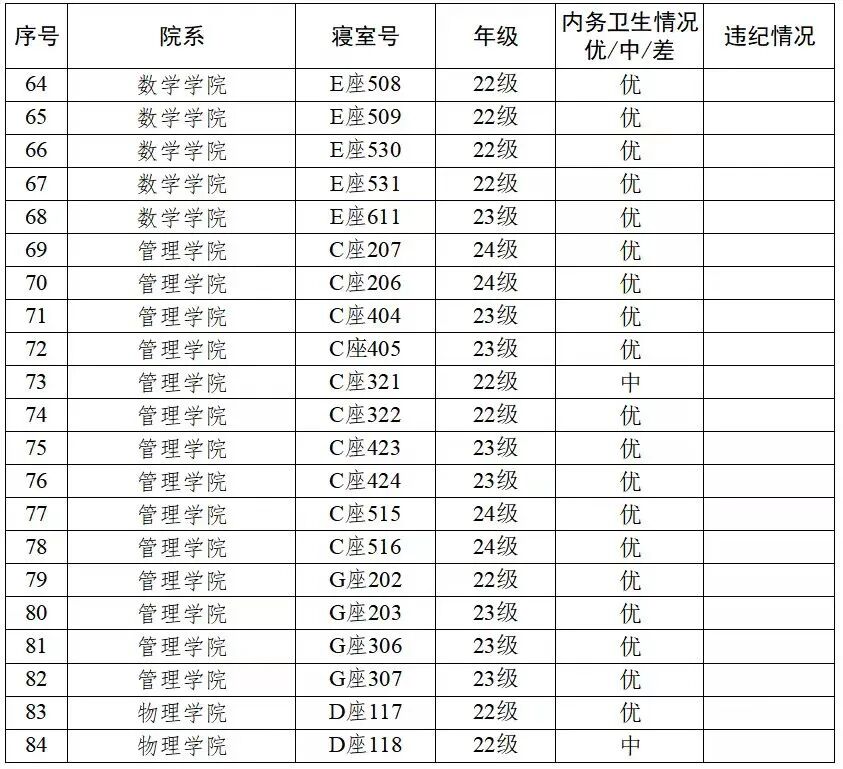 学生寝室是学生日常生活与学习的重要场所,是维护校园安全稳定、培养学生文明习惯的重要阵地。请各院系高度重视学生寝室的安全卫生工作,加大学生寝室安全卫生工作的检查、监督力度,切实保障学生生命财产安全,营造整洁健康的生活环境。