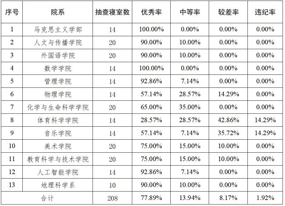 本次检查的寝室由学生处舍务科抽签决定,共抽取208个寝室,覆盖13个本科院系,涵盖2024级、2023级和2022级三个年级。其中,优秀162个、中等29个、较差17个,优秀率为77.89%,中等率为13.94%,较差率为8.17%,违纪率为1.92%。