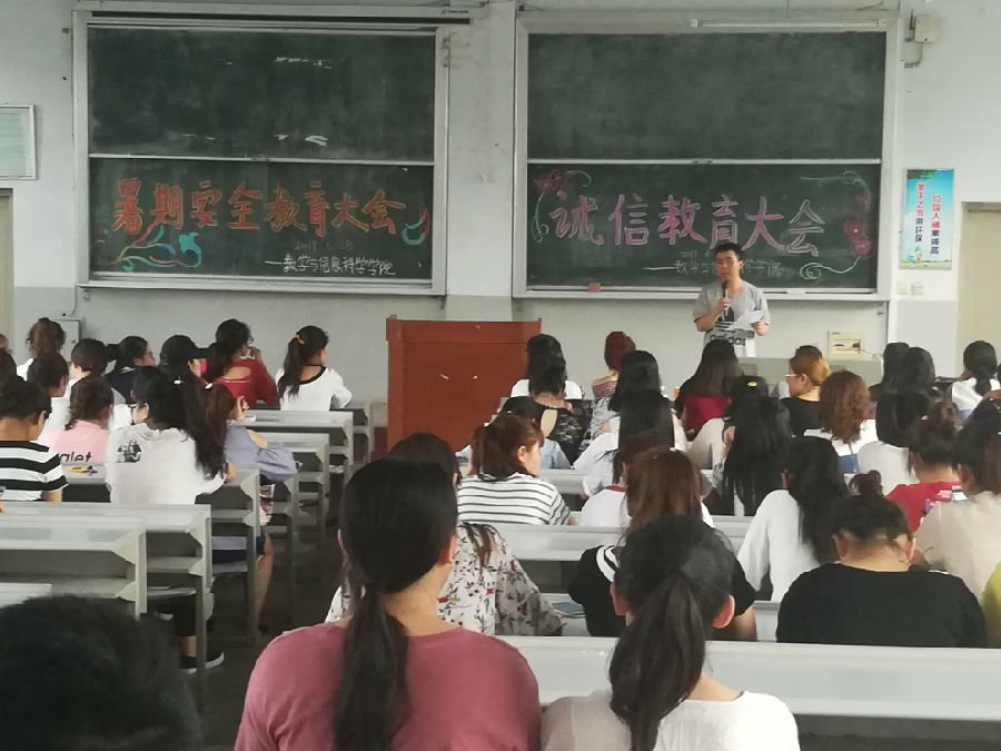 为了加强同学们的诚信教育和我院学生暑期安全教育工作,坚决防范学生意外事故的发生,数学与信息科学学院于2017年6月28日在多媒体教学楼104教室召开暑假安全教育大会和诚信教育大会。本次大会由数学学院辅导员陈威老师主讲,大一、大二、大三全体学生参会。