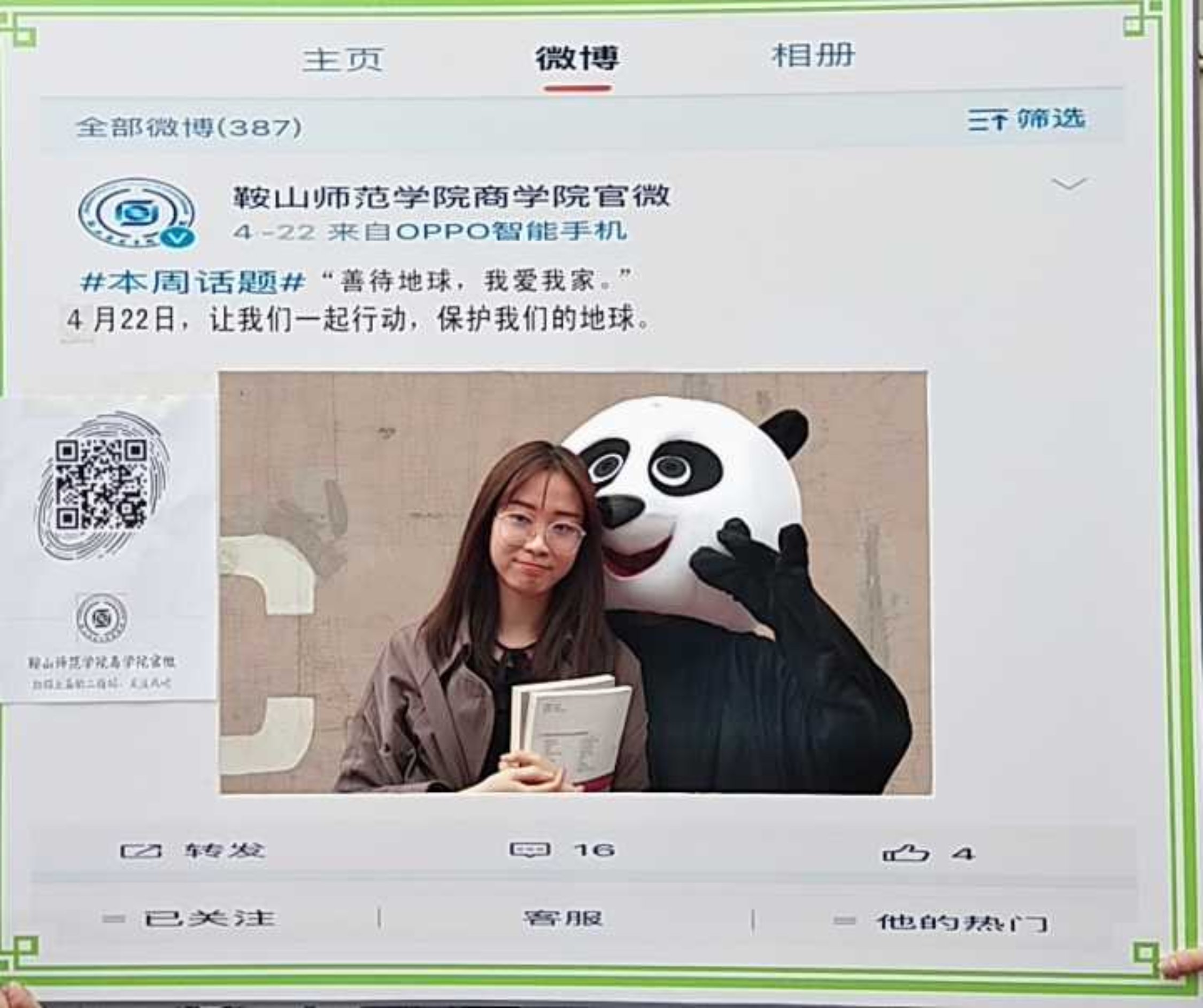 在这次活动中大家响应地球日的号召,美化生活环境,提高生活质量。活动过程中学生干部通过穿上玩偶服、跳舞、弹吉他等方式来吸引同学们,并向同学们讲解地球日的相关内容。学生干部还邀请各位同学与“善待地球,我爱我家”活动宣传板合影留念,并呼吁同学们在保护地球的签字板上签字,同学们更加了解了地球日的意义,提高了同学们对于现有环境问题的认识,并动员了同学们参与到环保运动中,通过绿色低碳生活,改善地球的整体环境。
