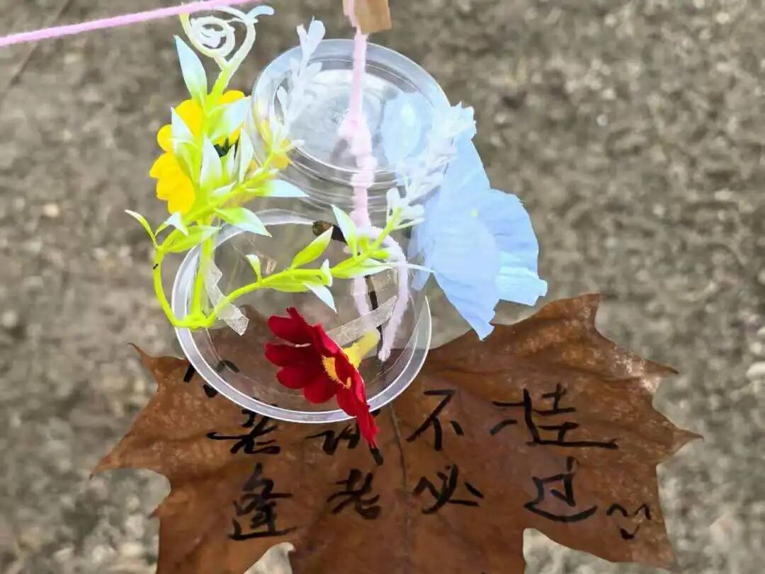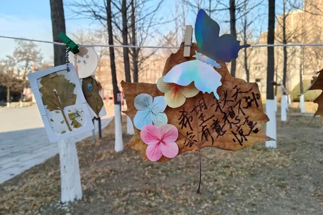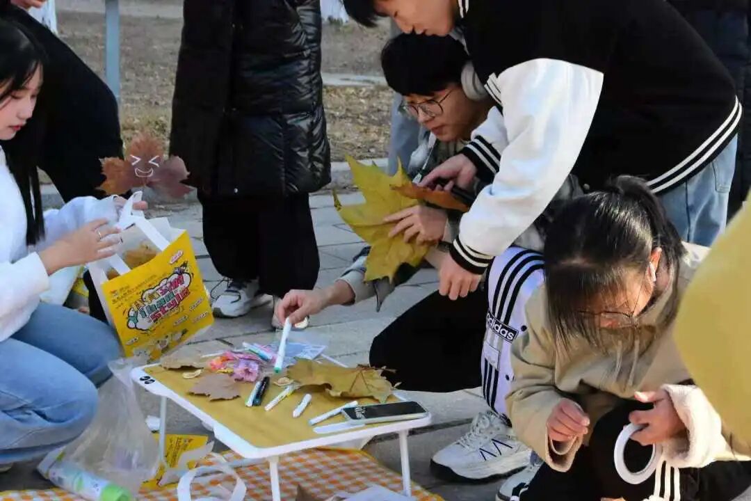 活动现场暖意融融,工作人员早早布置好创作区与展览区。同学们领取材料后,纷纷发挥创意:在白色马克杯上勾勒冬日雪景与萌趣图案、在火红枫叶上写下对生活的美好期许、用彩笔、贴纸等装饰出独一无二的作品。完成创作后,大家将作品悬挂在展览绳上,形成了一道靓丽的校园风景线,吸引了不少路过师生驻足欣赏。