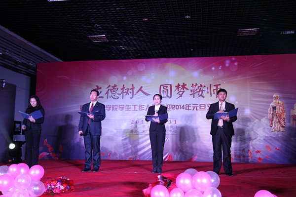2013年12月31日,由学生工作部(处)主办、里仁馆协办的“立德树人 圆梦鞍师”全体学生工作人员喜迎2014年元旦文艺晚会拉开了帷幕。栾培新副校长出席了晚会并致新年贺词,学生处、团委、公寓管理中心、招生就业指导处、各分院副书记辅导员、学生公寓楼长、学生干部代表也参加了晚会。